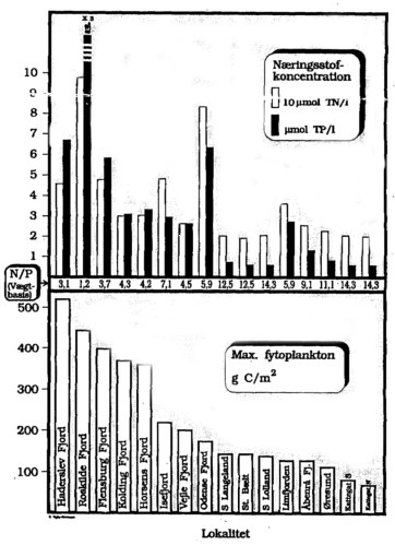 Endvidere er det useriøst, at vedtage mætninger, der ikke kan opfyldes selv ved omstilling til stenaldersamfundet. Top Behov for kvælstof En statistisk analyse af et betydeligt antal målinger fra 1970'ernes "Bæltprojekt" under Miljøstyrelsen viser bestemt ikke, at kvælstof er ansvarlig for problemerne. På 16 positioner i fjorde samt kystnære og åbne områder af de indre danske farvande blev der gennem en årrække målt gennemsnitlige koncentrationer af total-kvælstof og total-fosfor i overfladelaget (0-10 m). Herudover blev der målt maksimumværdier af fytoplanton (alger) i perioden maj-september.